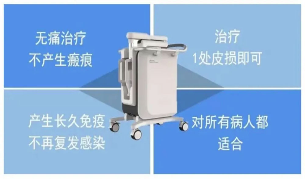 紅外特定波光能溫熱治療儀」簡稱「溫熱療法」,是歷經近20年基礎研究和科研臨床試驗,在國際上首先建立無創、非接觸、可耐受溫度範圍的免疫誘導治療HPV感染性皮膚病的成套治療方法。是借助紅外線溫熱治療平臺,利用特定波長的紅外光波及紅外光產生的溫度,對準人乳頭瘤病毒(HPV)感染病竈,活化局部淋巴細胞,誘導全身免疫,讓自身的免疫功能發生「精準對抗」,從而達到清除HPV病毒及疣體的目的,我院為了更好地服務北上港澳同胞的健康,引進了「紅外特定波光能溫熱治療儀」,得到滿意的臨床效果。